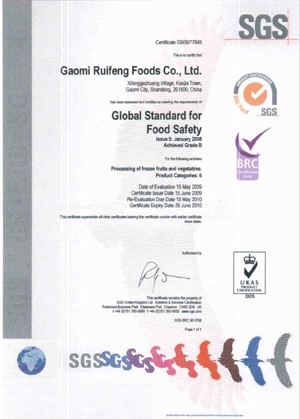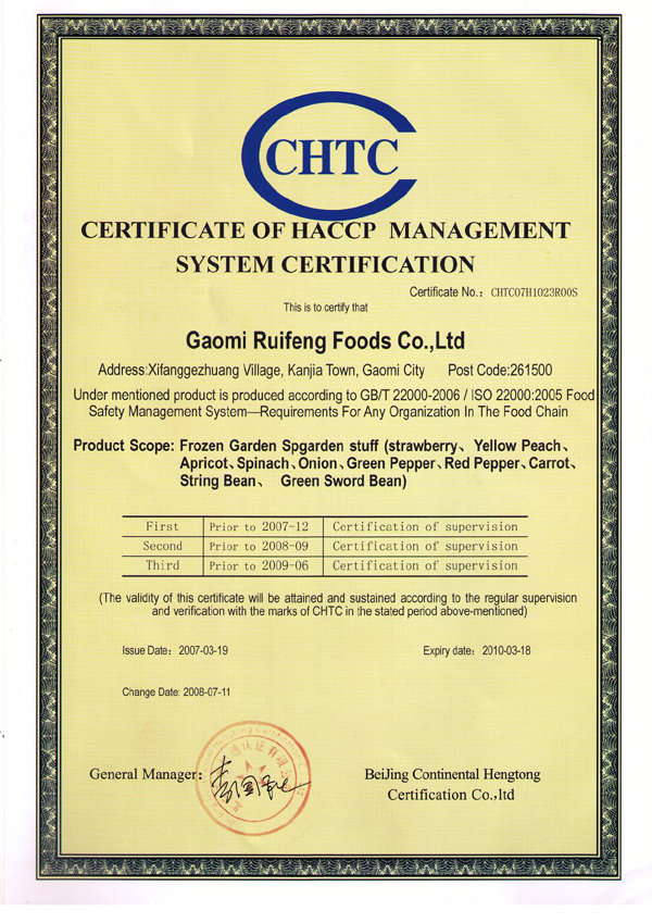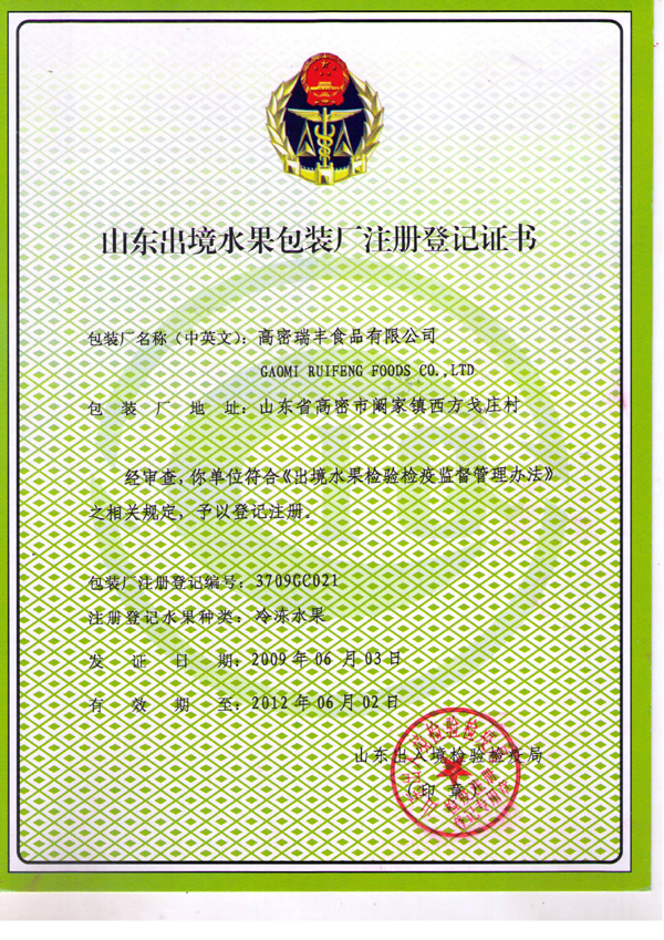 • 冷凍水果加工廠注冊證書