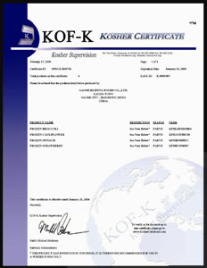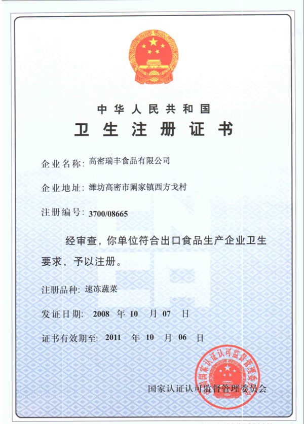 • 冷凍蔬菜衛(wèi)生注冊證書